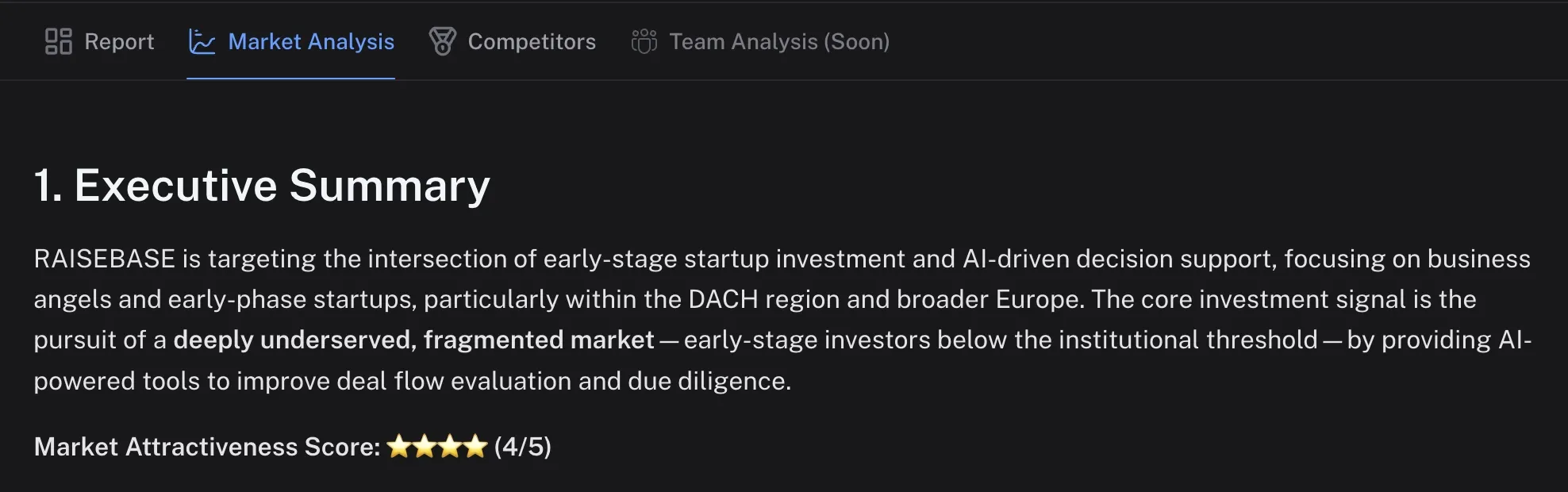 Raisebase is your AI copilot for pitch decks. Upload a deck and get a clear overview in minutes—enabling faster decisions, consistent evaluations, and less manual work.